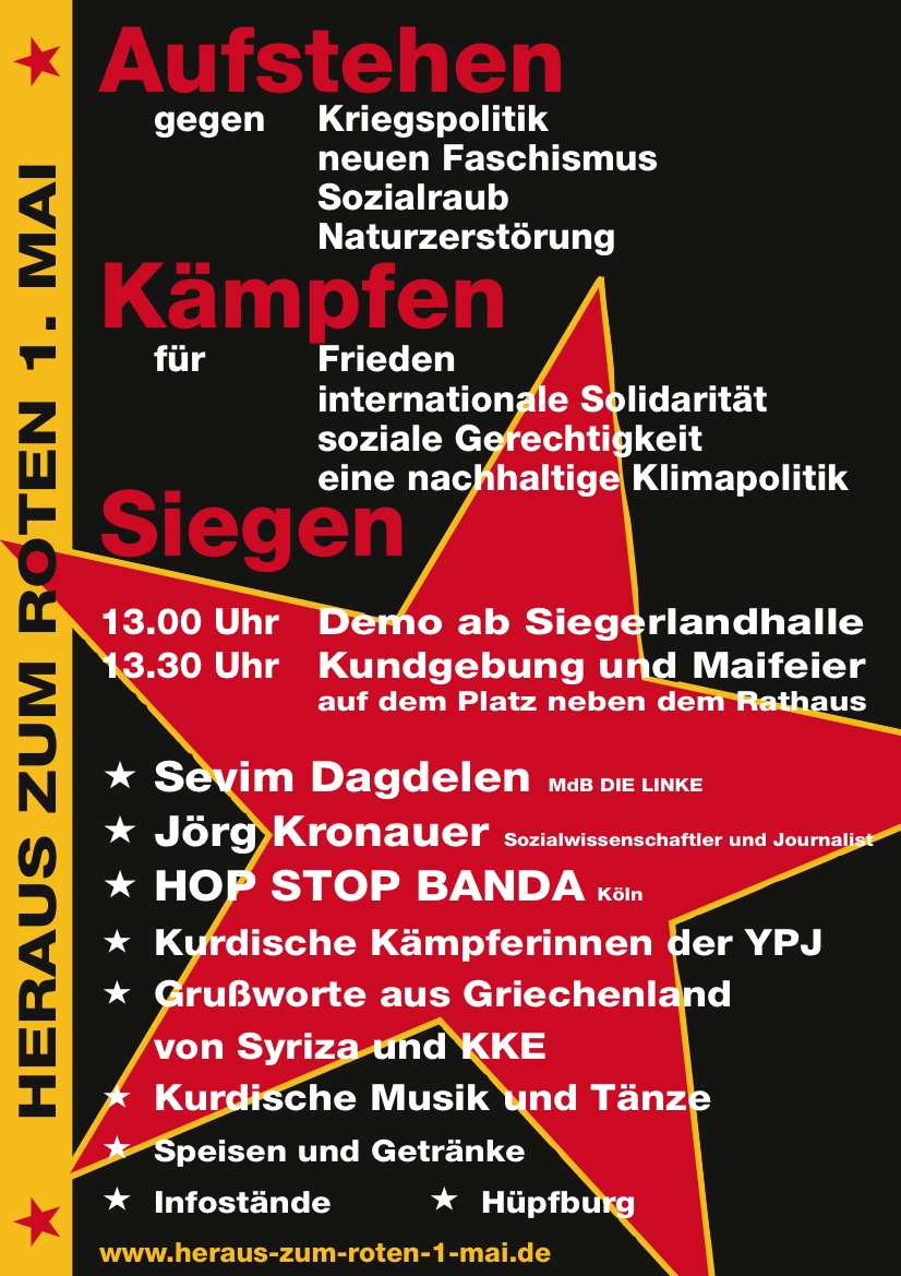![]() AufrufDer 1. Mai ist traditionell der Tag der Arbeiterklasse, der Werktätigen und lohnabhängig Beschäftigten, der kleinen Leute, der Ausgebeuteten und Ausgegrenzten, derjenigen die eben nicht zu den herrschenden Klassen oder den Reichen der Welt gehören. Der Rote 1. Mai in Siegen ist seit nunmehr 25 Jahren unsere Demonstration für eine linke und unabhängige Sicht auf die bestehenden Verhältnisse. Gegen die Kriegspolitik der NATODer neue Kalte Krieg, hervorgerufen durch die aggressive Ostausdehnung der NATO, manifestiert sich im Ukraine-Konflikt und basiert auf kapitalistisch-imperialistischen Interessen. Er birgt eine große Kriegsgefahr in sich. Auch die vielen Kriege im nahen und mittleren Osten und in Afrika bergen die Gefahr eines Flächenbrandes in sich. In all diesen Kriegen sind die USA und die Nato eine treibende Kraft. Nach der Inszenierung des gewaltsamen Umsturzes der Regierung in der Ukraine mit Hilfe der westlichen Allianz wird der Konflikt angeheizt: Einerseits diplomatische, militärische und finanzielle Hilfe für ein Regime in der Ukraine, das seine eigene Bevölkerung bombardiert und in dessen Staatsapparat Faschisten an exponierten Stellen sitzen und auf der einen Seite Sanktionen gegen Russland. Gegen die „Austeritätspolitik“ der BRD und die